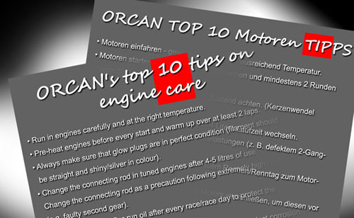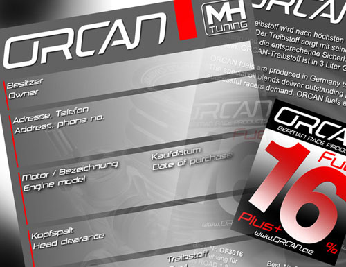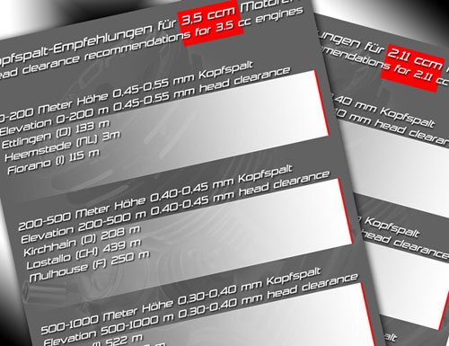 Auf Basis der Höhenangaben kann auf einfache Art der optimale Kopfspalt eurer 2,11 oder 3,5 ccm Motoren eingestellt werden, so dass sich ein jeweils perfekter Zündzeitpunkt zur Erreichung der bestmöglichen Leistung ergibt. Ebenfalls im Heft zu finden sind unsere ORCAN Top 10 Tipps zum optimalen Umgang und zur Pflege der Motoren. Darüber hinaus ist genügend Raum für eigene Notizen vorhanden.